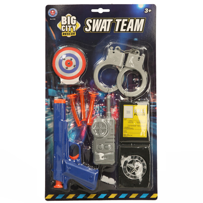 COMPLETE SET: Authentic SWAT team play set includes toy handcuffs, target board, toy gun, walkie-talkie, police badge and identification card for realistic role play